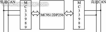 微处理器MC9S12DP256具有5个CAN模块,这里使用其中的两个:一个通过MC33989与低速网相连,实现与低速网的通信;另一个通过MC33989与高速网相连,实现高、低速网之间的通信以及对网络的管理。