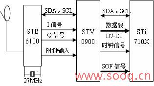 机顶盒的方案采用了三大模块,信号的接收及下变频模块,由STB6100完成;信号的解调模块,由STV0900完成;信号处理模块,由STi710x完成。