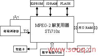 在STi710x模块中,E2PROM用于存放工作过程中的配置参数,同步存储器SDRAM用来运行程序,Flash用于烧写启动程序,智能卡接口用于完成条件接收功能。同时该扩展模块输出数字电视和VGA显示器所需要的信号,双口RAM用于完成STi10x和ARM板之间的通信。