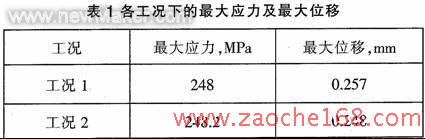 原结构采用的是ZG230-450,从计算结果来看,该模型最大应力处在其根部,约为250 MPa,整个根部区域应力基本都在200 MPa以上,已超过所选材料的屈服极限,在长期高应力作用下,极易产生疲劳断裂,与实际损坏部位一致(说明原模型简化合理准确),这是原结构破坏的主要原因。