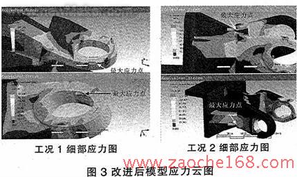 从结果来看,改进效果很好,最大应力值有很大降低,同时最大应力值位置发生改变,由原结构容易产生疲劳破坏的加强筋板根部转移到定位销孔台阶处。