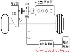 目前采用的并联式混合动力方案是一种前置前驱的中度混合形式。经过大量的方案选型和设计,采用性价比优良的超级电容储能装置,集成发动机、ISG电机、超级电容和双离合器等部件。它是将盘式一体化ISG电机直接安装在内燃机曲轴输出端, 电机转子和发动机曲轴直接连接,定子固定在发动机机体上。ISG电机取代了飞轮以及原有的起动机和发电机,图1为并联混合动力系统结构示意图。