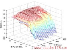 整个混合动力控制策略采用基于电子节气门的扭矩控制模式,优化目标是发动机的起动、怠速工况、加速工况、减速工况等瞬态工况。图3是发动机的转速-节气门开度-扭矩在稳态工况下的二维脉谱图,同样根据当前发动机的转速和需求扭矩,可以得到对应的电子节气门开度。