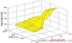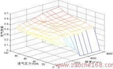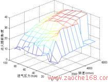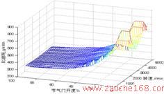 针对混合动力功能需要得到的目标,发动机方面需要标定的项目有,基本稳态工况下的点火提前角、喷油脉谱的标定试验;发动机大负荷下喷油脉谱修正和点火提前角修正的标定试验;发动机各个稳态工况下的氧闭环标定试验;发动机起动工况的标定试验;发动机怠速工况(包括大灯、空调、助力转向外在负荷)的标定试验;发动机各种温度、压力修正脉谱的标定试验;整车转鼓排放试验;整车冷起动标定试验;“三高”标定试验;驾驶性标定试验。图4为发动机稳态工况基本点火角脉谱,图5为发动机稳态工况充气效率脉谱。