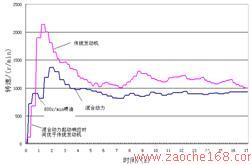ISG电机按照将电机恒转速控制将发动机拖转到喷油转速,当发动机被拖转时间大于6s或者发动机转速高于1200r/min时,电机停止助力。该控制策略提高发动机的喷油转速,避免了传统发动机起动工况的低转速、过浓喷油问题;同时怠速停机回避了发动机在怠速工况下的油耗,因此与传统轿车相比,起动和怠速工况,整车油耗可降低8~10%。图13是传统发动机与混合动力起动转速对比图。