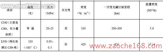 从表中看出,CNG 的组分除主要是CH4(甲烷)外,还有其他几种气体。不同气田生产的天然气其甲烷的含量不一样,一般在70%~95%之间,因此不同渠道的天然气在同一发动机上的功率输出和排放物会有很大差别。LNG由于液化过程经过纯化处理,气体组分稳定,甚至也可以象汽油、柴油一样建立不同质量标准牌号的LNG,这样发动机的燃烧就会稳定。因此对排气污染的控制就容易的多。LNG 的储存压力属于低压范围(0.05~0.5MPa)很安全。LNG 的密度是CNG 的2﹒97 倍,因此运输LNG 是很方便的。常压下1m3 天然气的热值略高于1L 汽油,而一体积LNG 相当于600 体积的天然气,这就是说一辆小汽车的油箱如若装60L 汽油,理论上需要100L 的LNG 才能产生同样的能量。在车辆上储存CNG 燃料箱的空间有限,目前CNG 汽车一次性充气的续驶里程只达到200~300km,而LNG 汽车的续驶里程可达800km。这样的续驶里程是用户可接受的。
