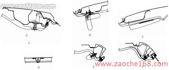 前周边与车体安装;D 硬顶中部与车体安装(用卡扣安装在顶盖横梁上);E 硬顶中部与车体安装(把手安装点);F 硬顶侧周边与车体安装;G 硬顶后周边与车体安装;成型硬顶的加工方法与使用性能主要取决于其材料性质。以往多数采用高压聚乙烯发泡材料制造。高压聚乙烯发泡材料具有无毒、质量轻、耐冲击、机械性能好、柔软性好等特点,但其成型性能差。目前,汽车顶棚采用多层材料复合成型的整体硬顶,由基材+缓冲隔热层+表皮层叠一体成型。基材可采用PU 发泡片材、PP 发泡片材、瓦楞纸、浸渍树脂的再生棉或玻璃纤维等,缓冲隔热层采用硬质聚氨酯泡沫塑料板,表皮材料主要采用织物、TPO 或PVC 膜。