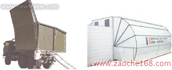 整体外伸缩式车厢与整体内伸缩式车厢组成部分相同,伸缩原理也基本类似,不同之处在于外伸缩式车厢的伸缩部分是在基型车厢外部伸缩,而内伸缩式车厢则与之相反。两者相比,外伸缩式车厢具有更大的扩展比,更合理的内部空间布局,然而车厢整备质量太大,整车高度过高,超过了铁路运输界线,不适于安装在越野车的底盘上。如比利时EMI( ESPACE MOBILE INTERNATIONAL)公司生产的CA600 通用型可扩展式军用厢式车(图7),该车采用法国雷诺(RENAULT)公司生产的M200 底盘,为液压扩展式,具有良好的密封性能及空气调节装置(制冷,制热能力较强),能够适应在沙漠地区以及环境气候恶劣的地区使用,曾在北约的部队中装备过一定数量。
