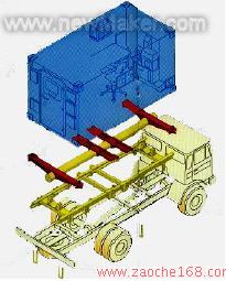 在需要车厢与底盘车分离的情况下,往往采用集装箱角件、转锁固定式连接方式。该连接方式对于汽车底盘要进行改装,设置集装箱转锁,可以在一定程度上降低车厢所承受的扭转力矩。车厢经常要与汽车底盘安装和分离,所以车厢通常设计成方舱型式。当车厢与汽车底盘分离后,可以进行铁、水、空等多种运输模式的转换。这种方式在车厢可拆卸式的军用厢式车上得到了广泛的应用。