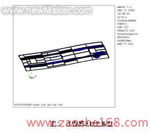 模态分析结果该车整体固有频率值不是很高,特别是低阶频率,说明整车动刚度较小,这主要是由于三级踏步改为两级踏步结构变化造成的;同时顶盖的局部模态出现又特别多,且频率值较集中,主要是顶盖两侧槽型纵梁的局部振型,振幅也较大,如果与路面等外部激振频率耦合极易导致共振,这是引起顶棚颤动,通道灯螺栓松动、通道灯跌落的主要原因;从振型图中可以看出后部两纵梁振幅较大,对该车的解剖后我们发现此处顶盖弯梁有一根已断裂,静力学计算此处应力并不大,应该是由于纵梁的振动导致的疲劳破坏。