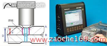高强钢焊点无损检测方法除了在线实时采集焊接过程信号来进行判断之外,还有焊后的离线无损检测方法。其中,最常用的是超声波无损探伤方法(如图5),它是利用超声波在焊点界面反射或穿透点焊熔核时的声波衰减程度和回波间隔来判断焊点质量的好坏。操作者手持探头,配合耦合剂,探头紧贴焊点表面,并与工件表面垂直,根据监视器显示的超声波曲线波形宽度和幅度等变化,来判断焊点质量好坏。