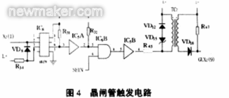 以U相为例,晶闸管触发电路如图4。取自主回路的交流波头信号(X2(1)-L+),经光耦IC8隔离,使6脚输出为低电位,经达林顿反相驱动IC5A反相为高电位。在EIN已为IC6的6脚提供开门信号SEIN的情况下,使IC6B(4)输出高电位,经IC5B反相为低电位,使脉冲高压器TC3的原边产生脉冲信号,副边输出触发信号GU给VT1的门极,使该晶闸管触发导通。当该相波头信号消失时,其触发信号也消失。当U1<L+时,该相晶闸管被负压关断。这样,各相晶闸管顺序开通与关断,完成三相半控整流。