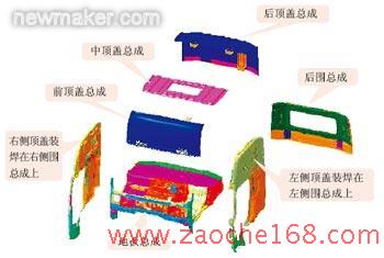 经过无数次地优化,在满足产品造型与结构强度,冲压工艺性与装焊工艺性,模具与夹具制造要求的基础上,确定了高顶前顶盖、中顶盖、后顶盖、左/右侧顶盖及9个顶盖加强梁的搭接边位置与尺寸,为了方便顶盖焊接,保留了中顶盖天窗洞口,并确定了天窗洞口尺寸。