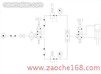 由于悬挂焊机气动控制系统只提供一种气源压力给焊枪,导致焊枪在焊接不同板材配合时只能提供一种压紧力进行焊接。在相同压力下,高强度钢板的配合面间隙大于普通低碳钢板,导致焊接部位产生飞溅,飞溅带走大量的热量和焊核金属,使形核难度增加,从而降低焊接强度。针对目前共线生产的4种车型中高档车大量采用大压力、低碳钢板,我们采用小压力提供给焊枪进行焊接,并对焊机气动控制系统进行改造(如图2)。