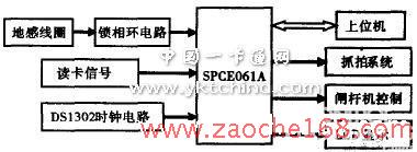 系统选用SPCE061A型单片机作为主控芯片,单片机通过读卡信号和锁相环电路的电平变化检测车辆的到来。DS1302时钟电路为系统提供精确的时间信息,通过驱动LED显示牌实时显示车位及时间信息,系统具备与上位机的串行通信通信接口。