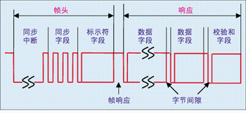 总线上的所有消息以帧的形式发送,帧由一个帧头和响应字段(response field)组成。主控器件始终在总线上发送帧头,帧头至少由一个13位字段、一个同步字节和一个6位标识符组成,该标识符的范围为0到63。响应字段由两个、四个和八个数据字节和具有倒置8位和的校验和字段,以及所有的数据字节和标识符组成。