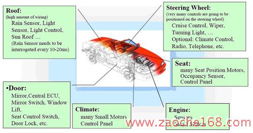 LIN主要用作CAN等高速总线的辅助网络或子网络,能为不需要用到CAN的装置提供较为完善的网络功能,包括空调控制(Climate Control)、后视镜(Mirrors)、车门模块(Door Modules)、座椅控制(Seats)、智能性交换器(Smart Switches)、低成本传感器(Low-cost Sensors)等。在带宽要求不高、功能简单、实时性要求低的场合,如车身电器的控制等方面,使用LIN总线可有效的简化网络线束、降低成本、提高网络通讯效率和可靠性。