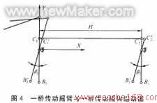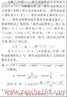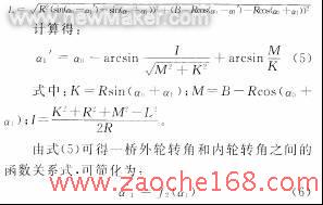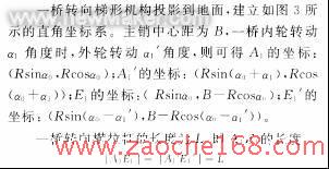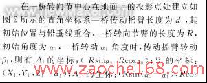 多轴转向汽车一般通过连杆机构来保证同一侧车轮在转向时绕同一瞬心作圆周运动。下面以常用的连杆机构中第一轴摇臂的摆角与车轮转向臂转角的对应为例,说明连杆机构的运动关系(如图2)。