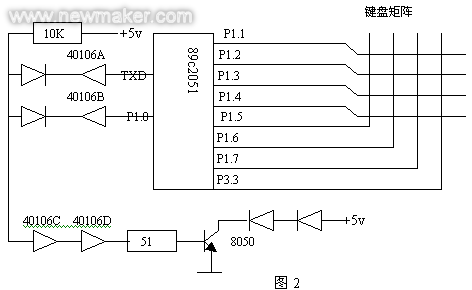 遥控发射器的专用芯片很多,但在汽车车号器遥控中,采用的是 89C2051 芯片。用P1口组成矩阵扫描反馈,获取键值,用内部的定时器1产生一个38K的软件定时中断,驱动P1.0产生一个38K的方波,当作红外线的调制基波,需要发送的数据,以串行方式,用波特率为1200,带奇偶校验的方式,直接送至TXD的串口发送端,而后TXD和P1.0进行逻辑与后,经过40106整形,用三极管驱动红外发射管直接发出。其原理图如下: