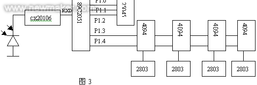 接收器部分,主要由CX20106和89C2051、显示驱动4094、2803及数据存储器和看门狗25045组成,用解码芯片CX20106把38K的载波过滤后,得到一组波形,即以波特率为1200的串口数据,直接送至89C2051的RXD接收,用软件读取串口,输入缓存,得到一组数据,判断正确后,存放在非易失性的EEPROM25045中,同时直接用脉冲移位方式,送数据至4094,经2803驱动后显示,同时用25045的看门狗定时,保证在程序失控等情况下,能正确返回而不造成错误接收。由于串行口方式传输,本身带有奇偶校验和起停位校验,可以大大提高数据的可靠性,同时在数据组中还加入了累加和校验,再次提高了可靠性,因此在实际应用中,即使在露天、太阳直射、光照很强等恶劣环境下,都能保证不会误收数据而造成显示错误。其原理图如下: