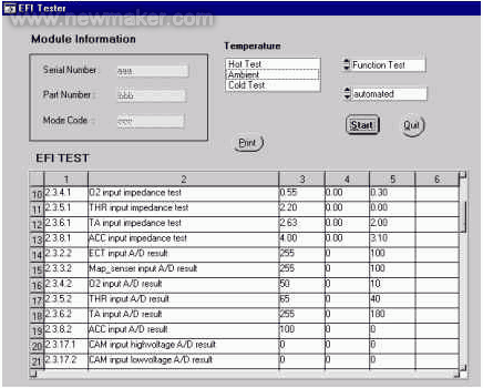 EFI模块测试系统是由NI测试仪、模拟负载箱、电源、条码扫描和测试夹具五部分组成。测试人员手动将模块放入夹具,并将条码扫描以后,系统将自动执行模块功耗、输入端对地电阻、A/D采样值、输出端漏电流、FET钳位电压、E2PROM校验等多项检验。同时记录检测数据及通过/失败状态,并将数据自动存储为TXT文件用于将来的数据分析。