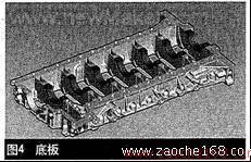 底板同样做成组合件,而且也是压铸件(见图4)。为了承受主轴承的力采用了钢粉末冶金的镶嵌件结构的其余部分还是用镁合金制成的。底板与曲轴箱上体之间通过螺栓连接。
