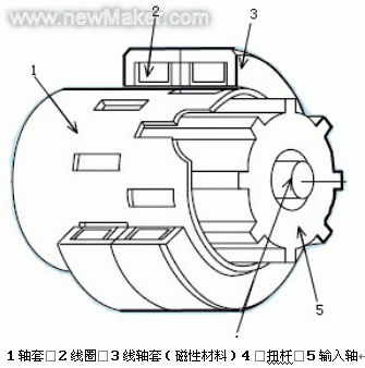 如图4所示为非接触式扭矩传感器的典型结构。输入轴和输出轴由扭杆连接起来,输入轴上有花键,输出轴上有键槽。当扭杆受方向盘的转动力矩作用发生扭转时,输入轴上的花键和输出轴上键槽之间的相对位置就被改变了。花键和键槽的相对位移改变量等于扭转杆的扭转量,使得花键上的磁感强度改变,磁感强度的变化,通过线圈转化为电压信号。信号的高频部分由检测电路滤波,仅有扭矩信号部分被放大。非接触扭矩传感器由于采用的是非接触的工作方式,因而寿命长、可靠性高,不易受到磨损、有更小的延时、 受轴的偏转和轴向偏移的影响更小,现在已经广泛用于轿车和轻型车中,是EPS传感器的主流产品。