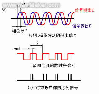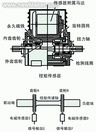 如图5所示为相位差传感方式来检测扭矩的扭矩传感器的结构和测量原理图,这种传感器具有高精度,高重复性的特点。其测量原理为:在受扭轴的两端各安上一个齿轮,对着齿面再各装一个电磁传感器,从传感器上就能感应出两个与动力轴非接触的交流信号。取出其信号的相位差,在这两个相位差之间,插入由晶体震荡器产生的高精度,高稳定的时钟信号。以这个时钟信号为基准,巧妙运用数字信号处理技术就能精确地测出所承受的扭矩。