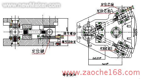 它是在端头与杆身进行单头铆合后与V型端头进行组合铆合时的专用铆合模具,在模具体的下模座上分别设计了两根与V型端头中心线对称的、夹角为48°29′的定位键,而定位芯座A、B可沿定位键滑动,以调节铆合长度。
