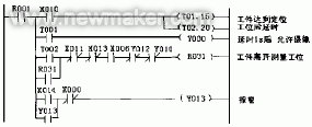 R001是内部继电器,表示选择“自动”,当PLC得到信号X010时,即传感器检测到定位工位有工件时,延时并输出允许摄像信号Y000,然后再延时2s(等待计算机作出判断)并且当翻转汽缸不在原位和翻转工位无工件时,输出工件可以离开定位工位信号。如果PLC接到计算机发出的“工件不合格”信号,即X014后,报警,直到按复位键停止报警。