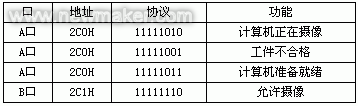 在计算机与PLC的集成控制系统中,一个关键的技术问题是计算机与PLC的通信问题。在本课题中,对于计算机与PLC之间的通信,我们考虑了两种实现方法:一种是利用串口通信,另外可通过I/O卡来实现。由于串口通信在实时性、可靠性、抗干扰性等方面都没有I/O卡好,又根据厂里具体情况,最后还是选用了后一种方法。I/O卡即开关量输入输出卡,在此项目中,我们选择了PCL—724,24位数字I/O卡,传输速率为300KB/s。该I/O卡具有2个八位端口(A,B),端口地址范围为200H~3FFH,两端口都可以进行输入输出操作,在进行输入输出操作时,无需进行握手,因为数据可以直接写或读到设定的端口。由PLC输入输出信号表可以看到,PLC需要接收计算机3个信号,计算机需要接收PLC一个信号。它们的通信协议定义与地址设定,如表2示。