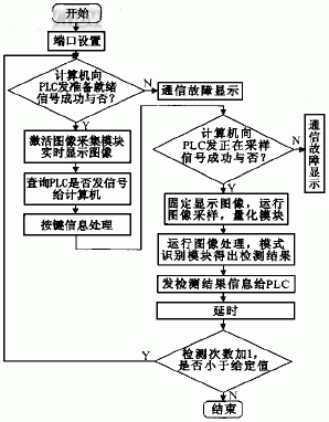 7,工控机执行程序由CCD摄像头摄取图像,由工控机实时处理图像,作出漏装或非漏装判断结果。把结果发给PLC;