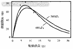 测试前,在应变仪上将各应变片的输出调整为零。分别测量了560 kPa、680 kPa 二种胎压下的侧向力和回正力矩。对560 kPa胎压, 载荷块所加载荷分别取为3.11 kN、5.93 kN、10.31 kN、11.18 kN和13. 03 kN;对680 kPa胎压,载荷块所加载荷分别取为3.11 kN、5.93 kN、10. 31 kN、11.18 kN和12.18 kN。