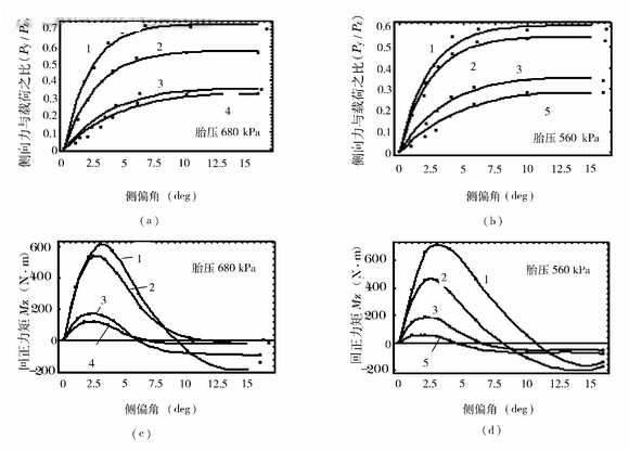 由实验曲线得到的侧向附着系数和侧偏刚度是有限载荷区间上的离散值,还不能完全描述其在整个载荷轴上的分布情况,根据已经得到的数据,并参考以往其它轮胎侧偏试验结果,发现侧向附着系数总是关于轮胎载荷单调下降的,侧向附着系数与轮胎载荷的关系及侧偏刚度和轮胎载荷之比与轮胎载荷的关系具有如下的一般形式: