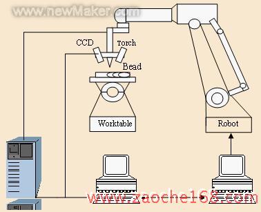 局部自主智能焊接机器人(Local Autonomous Intelligent Welding Robot)系统的核心是一台PIII850的通用计算机,它提供完成机器人系统坐标变换,轨迹生成,插补运算及外部信息综合和焊接系统的控制,状态管理,任务调度等。它的作用是一台中央监控计算机,它与机器人控制柜通过CAN总线通讯。它与导引、焊缝跟踪模块以及熔透控制模块之间通过Ethernet通讯。导引、焊缝跟踪模块的功能是通过视觉传感实现焊接机器人焊接初始位置的导引和焊缝跟踪。LAIWR机器人第七轴上的一个CCD摄像机通过视频电缆与导引、焊缝跟踪计算机上的图像采集卡相连。LAIWR机器人第七轴上的另一个CCD摄像机通过视频电缆与熔透控制计算机上的图像采集卡相连(硬件配置同导引、跟踪模块)。同时熔透控制计算机还通过自行开发的控制/采集接口电路与焊接电源相连,以实现焊接参数的实时控制和焊接参数采集。焊接电源采用了日本DAIHEN公司生产的INVERTER ELESON 500P型交直流两用GTAW焊接电源。此外,系统还包括水箱和保护气瓶等辅助设备。