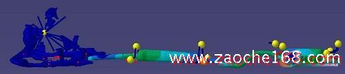 图6为车身地板和排气系统在46Hz附近的振型图,可以看出动力总成二阶激励在46Hz附近可能会引起地板的剧烈振动,有必要加强车身地板或降低排气系统振动水平。由于在46Hz附近,整个地板以排气系统2#挂钩附近为中心振动,整体加强存在困难,所以首先考虑对排气系统进行优化,初步优化方案:1)考虑到波纹管刚度较大,首先选择刚度较小的波纹管;2)通过调节排气系统悬置刚度来在满足限位的情况下调整整个排气系统模态振型,避开与地板共振。