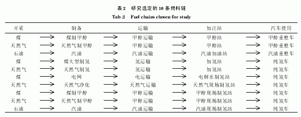 首先根据一定的氢源方案筛选原则,从众多的燃料链中最终确定10条燃料链作为研究对象,分别包括了以煤、天然气和石油为初级能源的路线,也概括了高压氢气、车载甲醇制氢、车载汽油制氢三种氢源,所涉及的燃料加注站有:氢站(纯氢站、甲醇现场制氢、天然气现场制氢、汽油现场制氢)、甲醇加注站和汽油加注站,如表2所示。