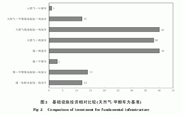 同时还进行了环境、经济性和能效性(3E)的全面评估,并以天然气制甲醇的车载制氢燃料链为基准进行了各方案基础性投资的对比,结果如图1、图2所示。