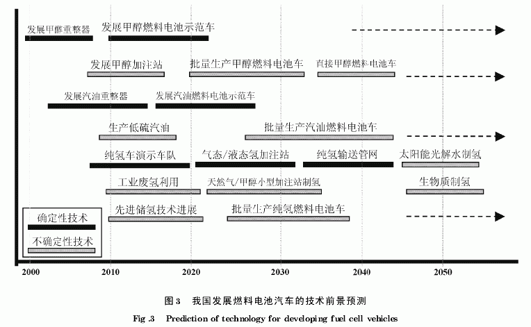 由于在新技术发展的初期存在太多的不确定因素,包括技术和经济可行性以及国家政策等,因此预测也将存在很大的不确定性。总体上讲,燃料电池汽车技术将会呈现多元化而且相互渗透式发展,也就是说燃料电池的氢源选择不太可能局限于某一种方式,而是多种方式并存并且共同发展,而各种氢源选择方式之间既相互促进,又相互限制。目前国际有关机构已对很多制氢技术进行试点运作,我国的技术与国际先进水平相比尚有差距而且存在国情差异,因此是否会相应推广这些技术还有待在实际发展中检验。