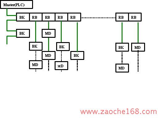 现场一共有十个滚床输送段,做成2层网络,第2层网络有10个分支。设计者在主控柜中的第一个从站的耦合器(BK)之后就扩展了10个分支模块(RB),每个RB后面再通过INTERBUS总线连接“BK”或马达启动器,上例中每个滚床配置一台马达启动器用来驱动滚床电机,所有驱动控制信号通过INTERBUS总线传输,MD上带有数字量输入接口,现场的传感器通过MD传到PLC。用来驱动各自工艺段的电机和收集输入信号。网络结构非常清楚,每段分支,每个设备都可以单独的关断单独调试。这样的结构,对设备的调试和管理而言,无疑是最方便的。