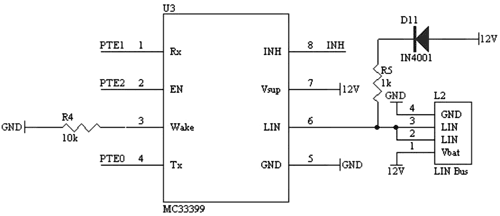 MC33399收发器支持的传输速率为1~20Kb/s,提供了正常和睡眠两种工作模式。INH引脚连接到电源管理芯片的INH引脚,可以控制电源电压调节器的工作模式,减小睡眠时的功耗。EN引脚由GZ60的PTE2引脚控制,当PTE2=1时,MC33399使能,进入工作模式;当PTE2=0时,MC33399禁能,进入睡眠状态,从而达到减小功耗的目的。Tx、Rx引脚分别与GZ60的PTE0、PTE1引脚相连,通过该ECU的ESCI模块来实现LIN总线的收发功能。由于不采用唤醒模式,Wake引脚通过电阻R4接地。其中,只有主节点的LIN引脚需要通过二极管和1kΩ电阻拉高,从节点所需的30kΩ上拉电阻已经集成在MC33399中,所以从节点无须外接上拉电阻,如图3所示。