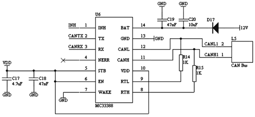 车灯控制系统中的主节点同时也是CAN/LIN网关,负责将LIN总线数据传输到CAN总线上,GZ60的一个CAN通道用来提供与CAN总线的接口。CAN总线收发器选用Freescale公司的MC33388。该收发器支持的最高CAN速率为125Kb/s,在睡眠模式下,功耗很小。CAN模块的硬件电路如图4所示。