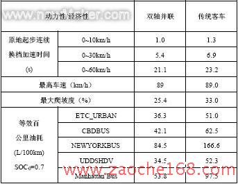 从表3 可以看出没有一种布置型式是最佳的。考虑到项目开发目标,以燃油消耗和成本为最高指标,对串联、并联两种形式进行了初步的仿真研究,混联一般不用在大客车上。仿真结果列入表4。