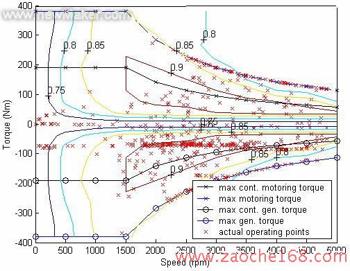 图6 为UDDSHDV循环工况下电机实际工作点分布。从图中可以看出:电机的工作点大部分分布在持续转矩曲线附近,这一区间电机的效率最高。尤其是再生制动时,回收制动能效果最好。