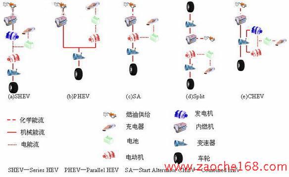 既继承了电动车辆作为“绿色汽车”的节约能源和超低排放的优点,又弥补了电动车辆续驶里程短的缺点,无须停车充电或频繁更换电池。混合动力汽车(HEV, hybrid electric vehicle)采用内燃机和电动机作为混合动力源,集中了两者的优点。已经成为国际公认的解决汽车尾气排放和石油资源匮乏两大难题的有效方法,是清洁汽车中最具有产业化和市场化前景的车型。与传统汽车相比,燃油消耗可降低40%~50%,尾气排放指标可降低50%~60%[1]。同时,在配套设施方面,不需象燃气汽车和电动汽车那样投入巨资进行加气站和充电站的建设,易于推广。因此,在电动汽车技术取得重大突破之前,混合动力汽车成了各国的主要选择。