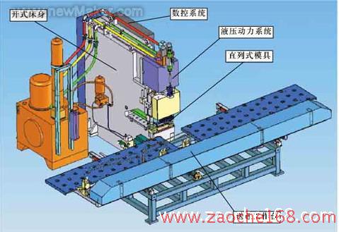 主机为TP120型数控液压冲孔机,主要由开式床身、液压动力系统、直列式模具、送进工作台、气动、润滑及数控系统等部分组成(见图3)。主机机身为开式结构,与送进工作台分立,由钢板焊接而成的机身经过去应力退火热处理,以确保足够的刚性和加工精度;液压系统则采用德国哈雷公司全套产品。