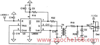 在能量回馈时,开关管Sd处于工作状态,为了保证系统能量充分回馈,同时避免开关管Sd长时间承受大的回馈电流,采用555构成的频率为20kHz的“多谐振荡器+高频脉冲变压器”来驱动Sd。