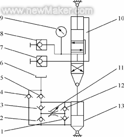 1、2、3、4、5、12. 单向阀 6. 补油箱 7、8. 快速接头 9. 压力表 10. 被测转向助力器 11. 节流加载阀 13. 加载液压缸