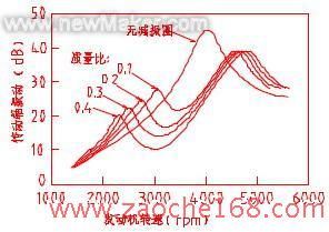 从图3 可以看出,当调谐比大于1 时,系统的振动特性曲线向高频段移动,高端峰值减小,低端峰值增大;当调谐比小于1 时,结果正好相反;当调谐比等于1 时,理论上可以取得最大的汽车传动轴振动响应抑制作用。但是当发动机低速运转时,路噪和风噪相对较强,所以实际上我们通常选取的减振圈调谐比总是小于1。