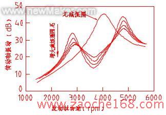 与传动轴一样,由钢铁质量、橡胶弹簧组成的减振圈也是一个具有本身固有频率的振动系统。减振圈与传动轴构成的组合系统将具有两个共振频率,分别位于原传动轴的共振点两侧,而且组合系统的两个新共振频率及振动幅度可以通过减振圈的质量、固有频率和阻尼系数来调制。